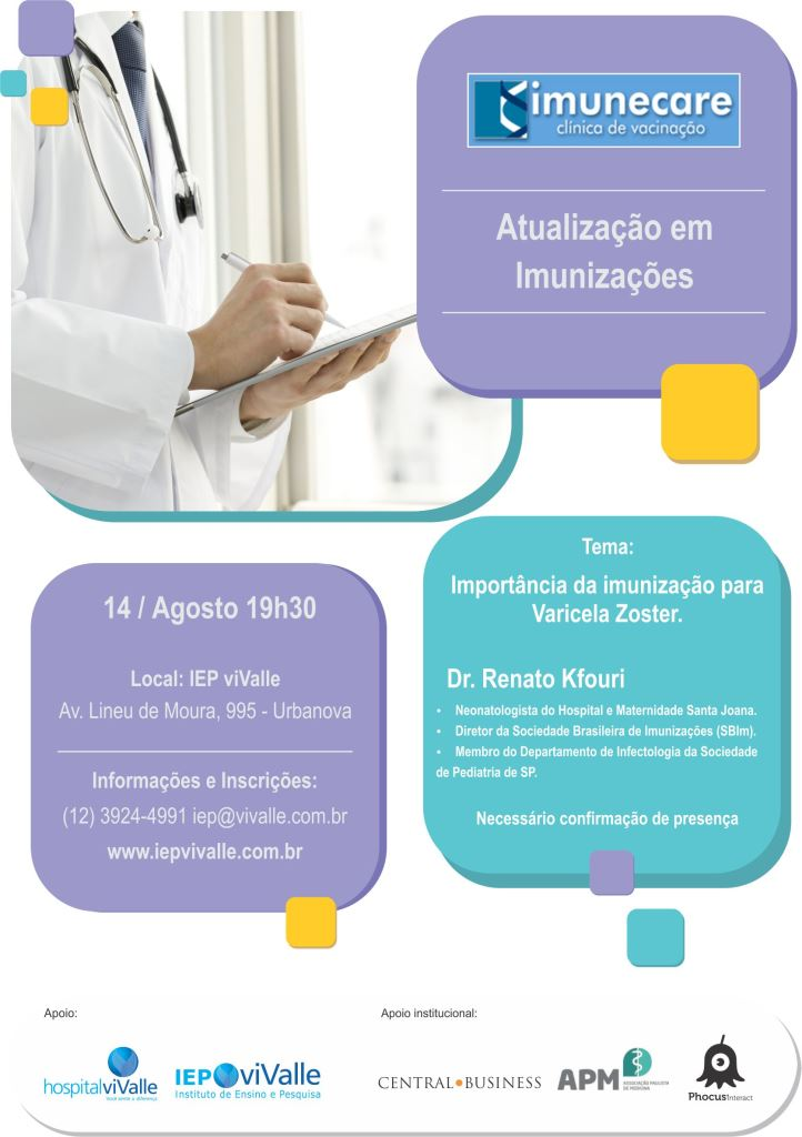 O IEP viValle e a Clínica Imunecare apresentam o curso gratuito "Importância da Imunização para Varicela Zoster". As vagas são limitadas e é necessária a confirmação de presença.