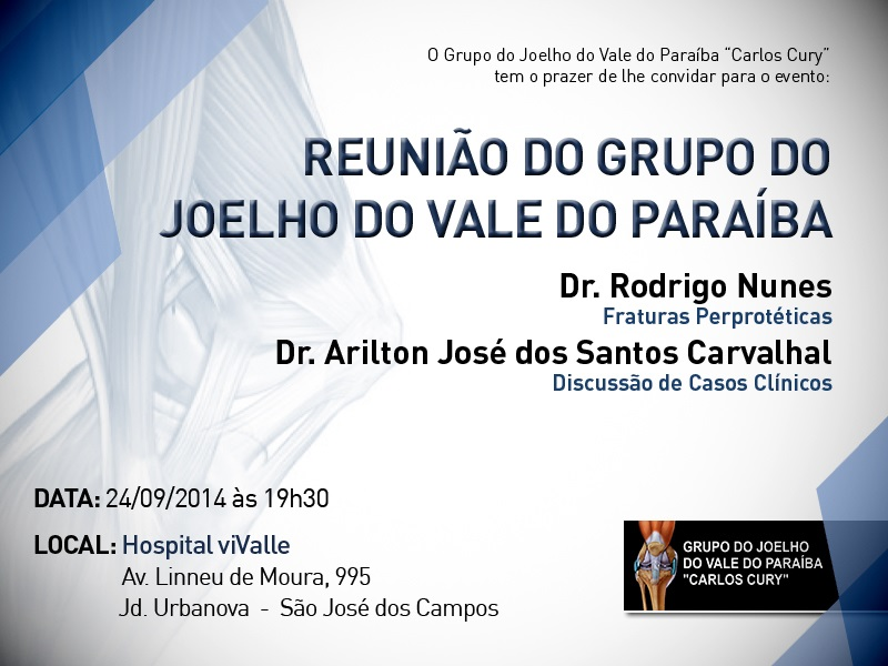 Dia 24 de setembro, quarta-feira, o IEP recebe a reunião do Grupo do Joelho do Vale do Paraíba "Carlos Cury". O evento será realizado no Auditório do IEP viValle. As vagas são limitadas e é preciso confirmar presença.