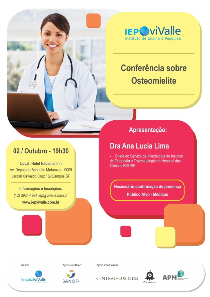 O IEP viValle apresenta aos médicos a Conferência sobre Osteomielite. Apresentado pela Dra. Ana Lucia Lima, chefe do Serviço de Infectologia do Instituto de Ortopedia e Traumatologiado Hospital das Clínicas FMUSP, o evento será realizado no Hotel Nacional Inn e é necessário fazer inscrição prévia.
