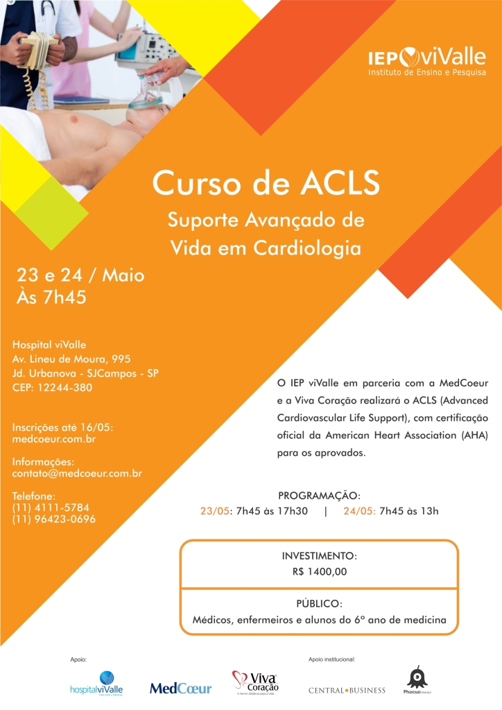 O IEP viValle, em parceria com a MedCoeur e a Viva Coração, realizará o curso de ACLS (Advanced Cardiovascular Life Suport), com certificação oficial da American Heart Association (AHA) para os aprovados.
