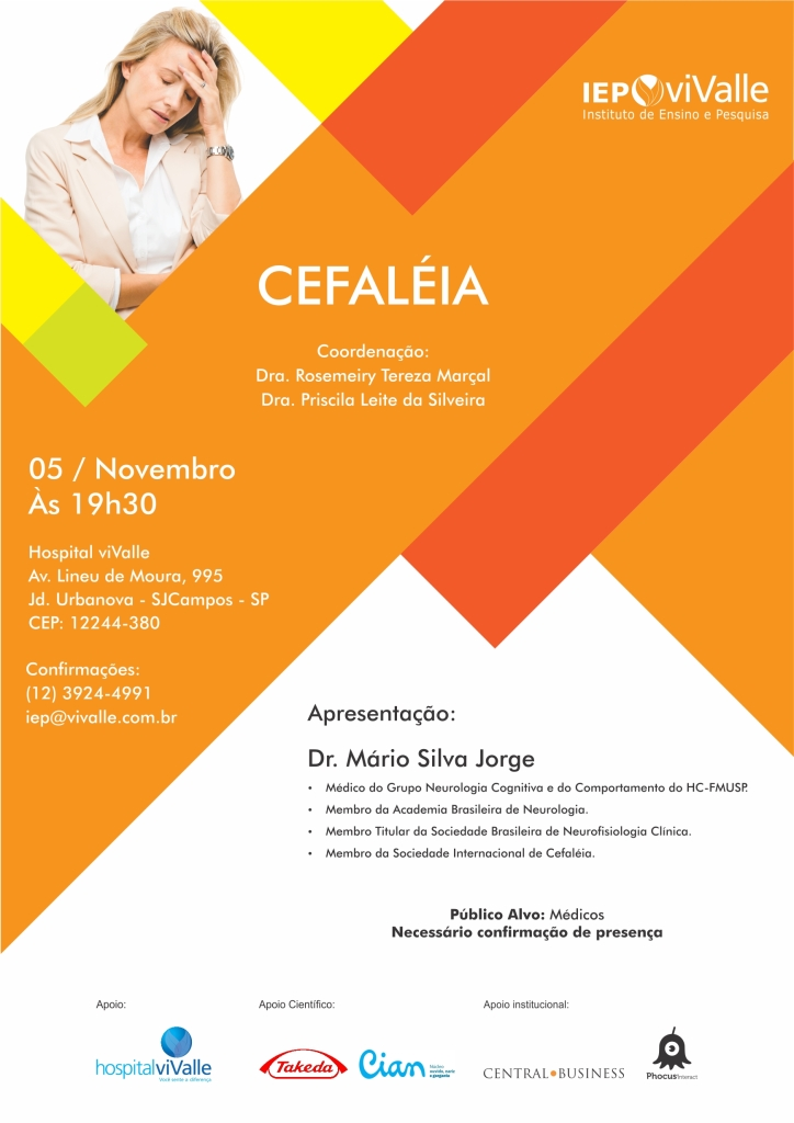 O IEP viValle, em parceria com o laboratório Takeda e a Clínica Cian, tem a honra de convidá-lo a participar de curso sobre "CEFALÉIA", dia 05/11 às 19h30.