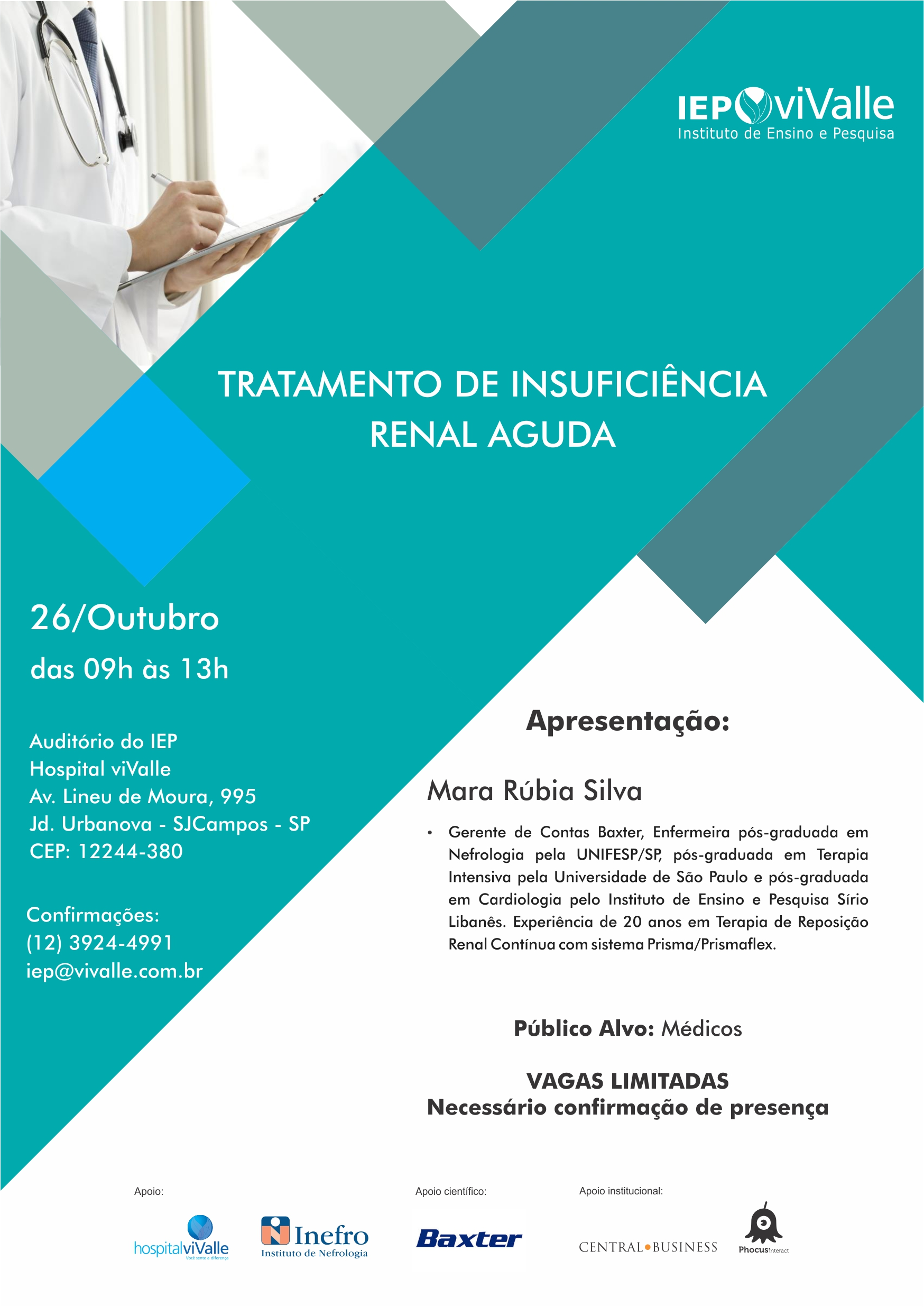 O IEP viValle, em parceria com o Instituto de Nefrologia - Inefro e a Baxter, tem a honra de convidá-lo a participar do evento "Treinamento de Insuficiência Renal Aguda", que será realizado no dia 26/10 (segunda-feira) das 9h às 13h.