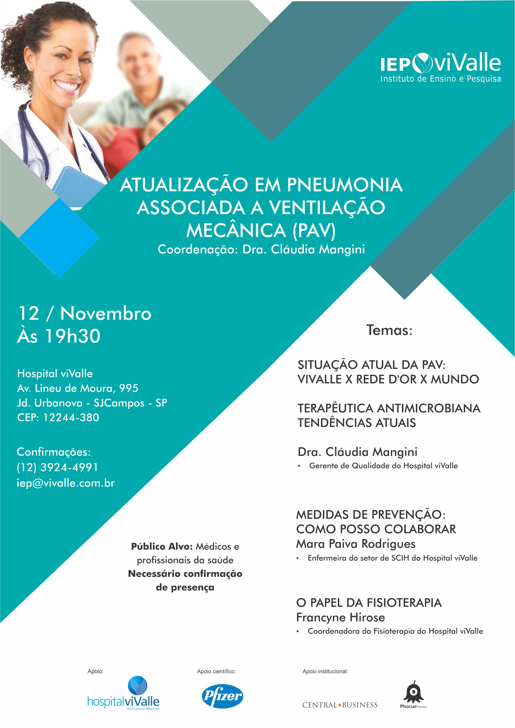 O IEP viValle realizará um curso sobre "Atualização em pneumonia associada a ventilação mecânica (PAV)", no dia 12/11 às 19h30.