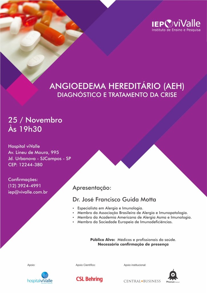 No dia 25 de novembro, às 19h30, o IEP viValle realizará um curso em parceria com o laboratório CSL Behring sobre "ANGIOEDEMA HEREDITÁRIO (AEH) - DIAGNÓSTICO E TRATAMENTO DA CRISE ".