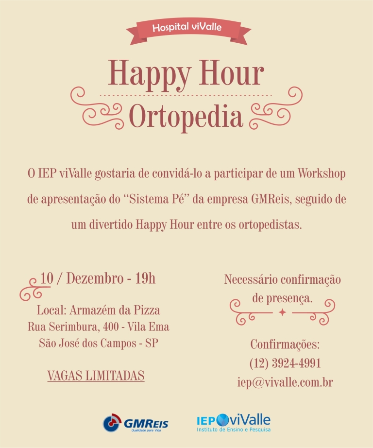 O IEP viValle gostaria de convidá-lo a participar de um Workshop de apresentação do ‘‘Sistema Pé’’ da empresa GMReis, seguido de um divertido Happy Hour entre os ortopedistas.