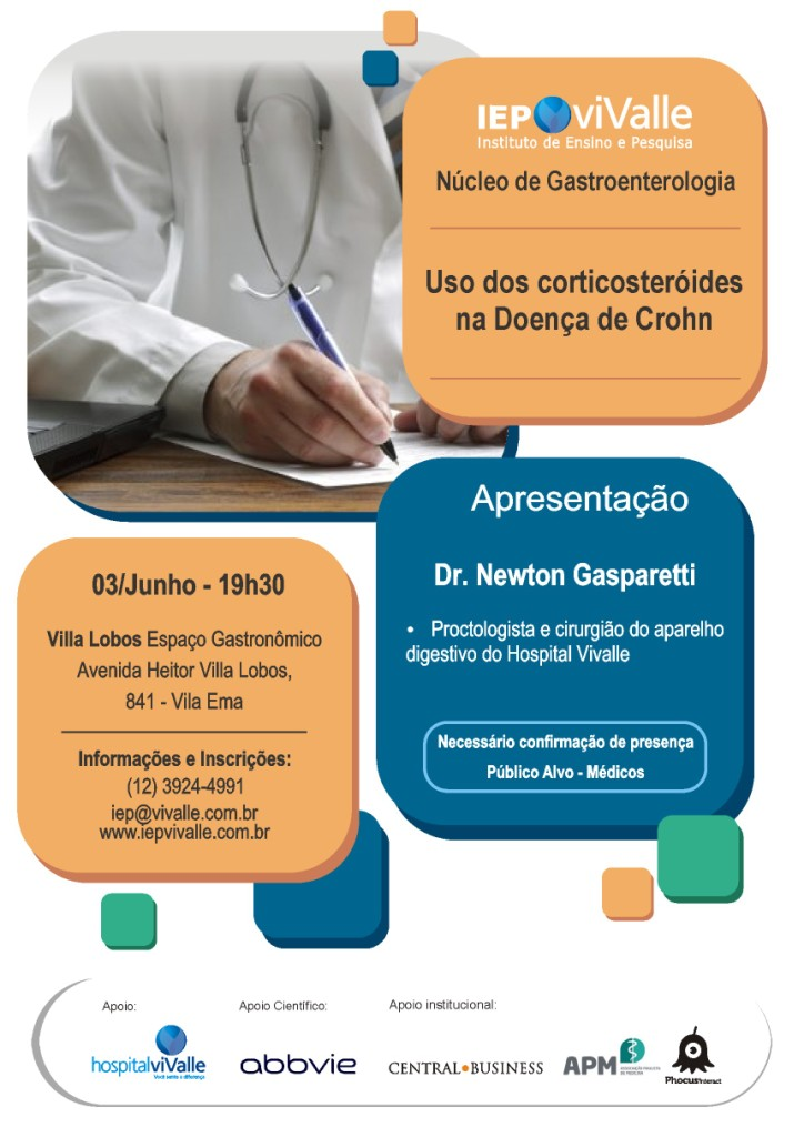 O Núcleo de Gatroenterologia apresenta amanhã, dia 03, o tema "Uso de Corticosteroides na Doença de Crohn". A reunião será no espaço Villa Lobos e as vagas são limitadas.