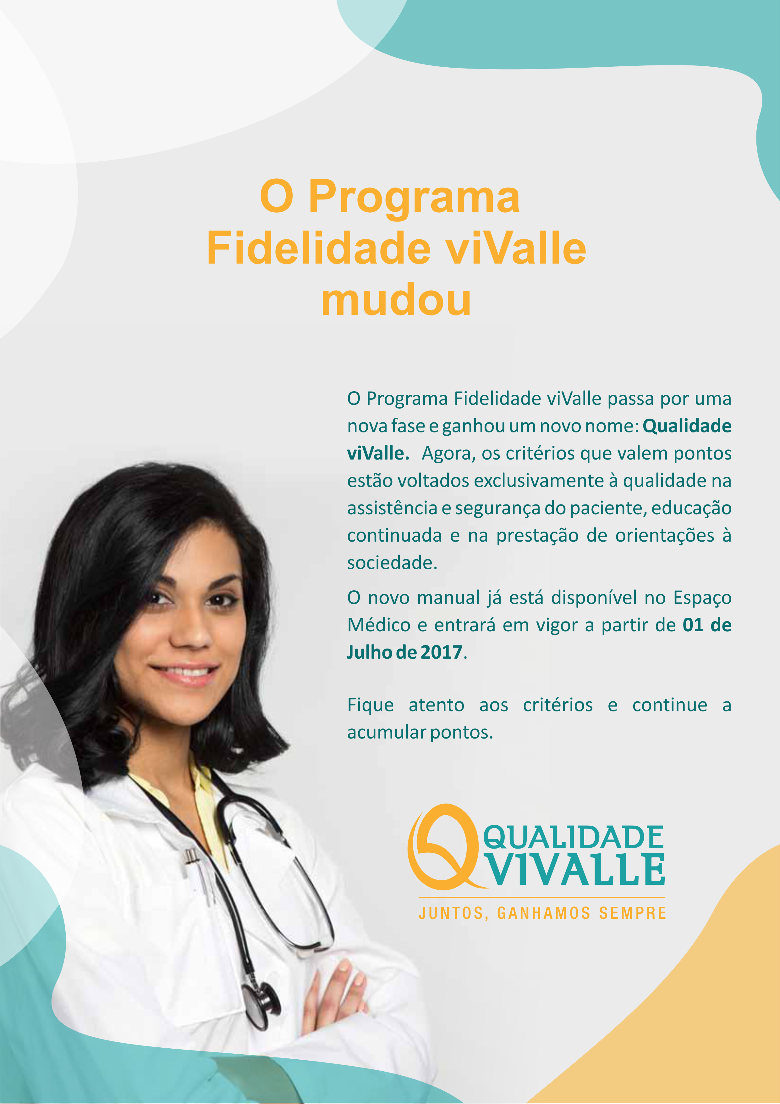 O Programa Fidelidade viValle passa por uma nova fase e ganhou um novo nome: Qualidade viValle. Agora, os critérios que valem pontos estão voltados exclusivamente à qualidade na assistência e segurança do paciente, educação continuada e na prestação de orientações à sociedade.