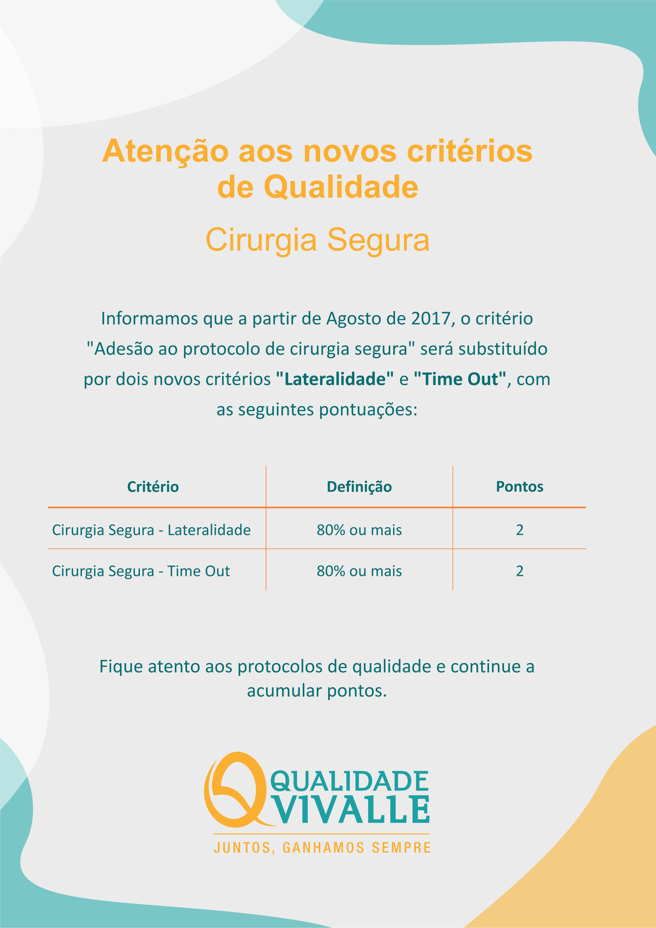 Informamos que a partir de agosto de 2017, o critério “Adesão ao Protocolo de Cirurgia Segura” será substituído por dois novos critérios “Lateralidade” e “Time Out”, com as seguintes pontuações: