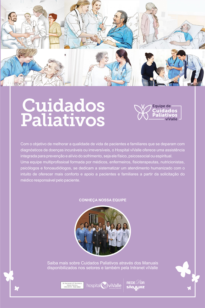Com o objetivo de melhorar a qualidade de vida de pacientes e familiares que se deparam com diagnósticos de doenças incuráveis ou irreversíveis, o Hospital viValle oferece uma assistência integrada para prevenção e alívio do sofrimento, seja ele físico, psicossocial ou espiritual.