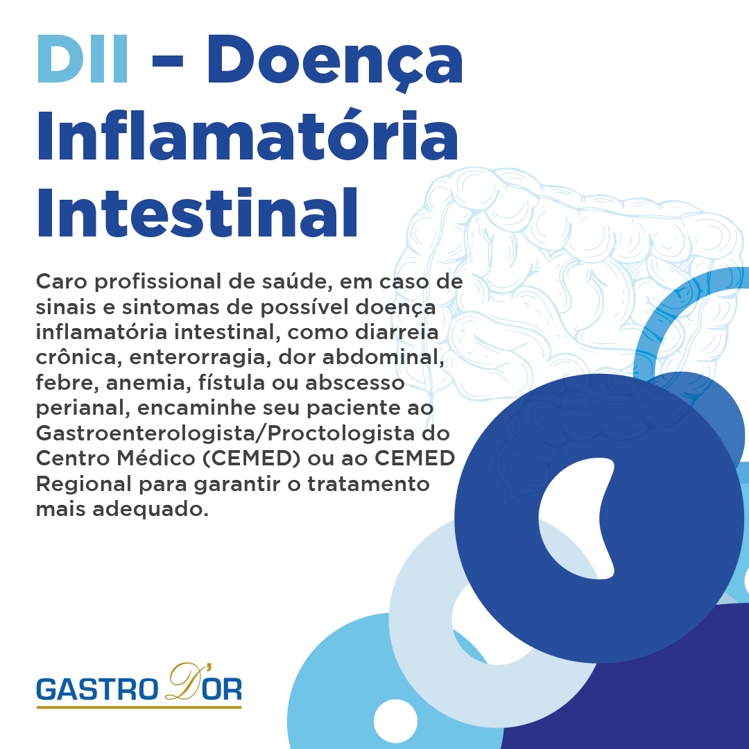 Caro profissional de saúde, em caso de sinais e sintomas de possível doença inflamatória intestinal, como diarreia crônica, enterorragia, dor abdominal, febre, anemia, fístula ou abscesso perianal, encaminhe seu paciente ao Gastroenterologista/Proctologista do Centro Médico (CEMED) ou ao CEMED Regional para garantir o tratamento mais adequado.