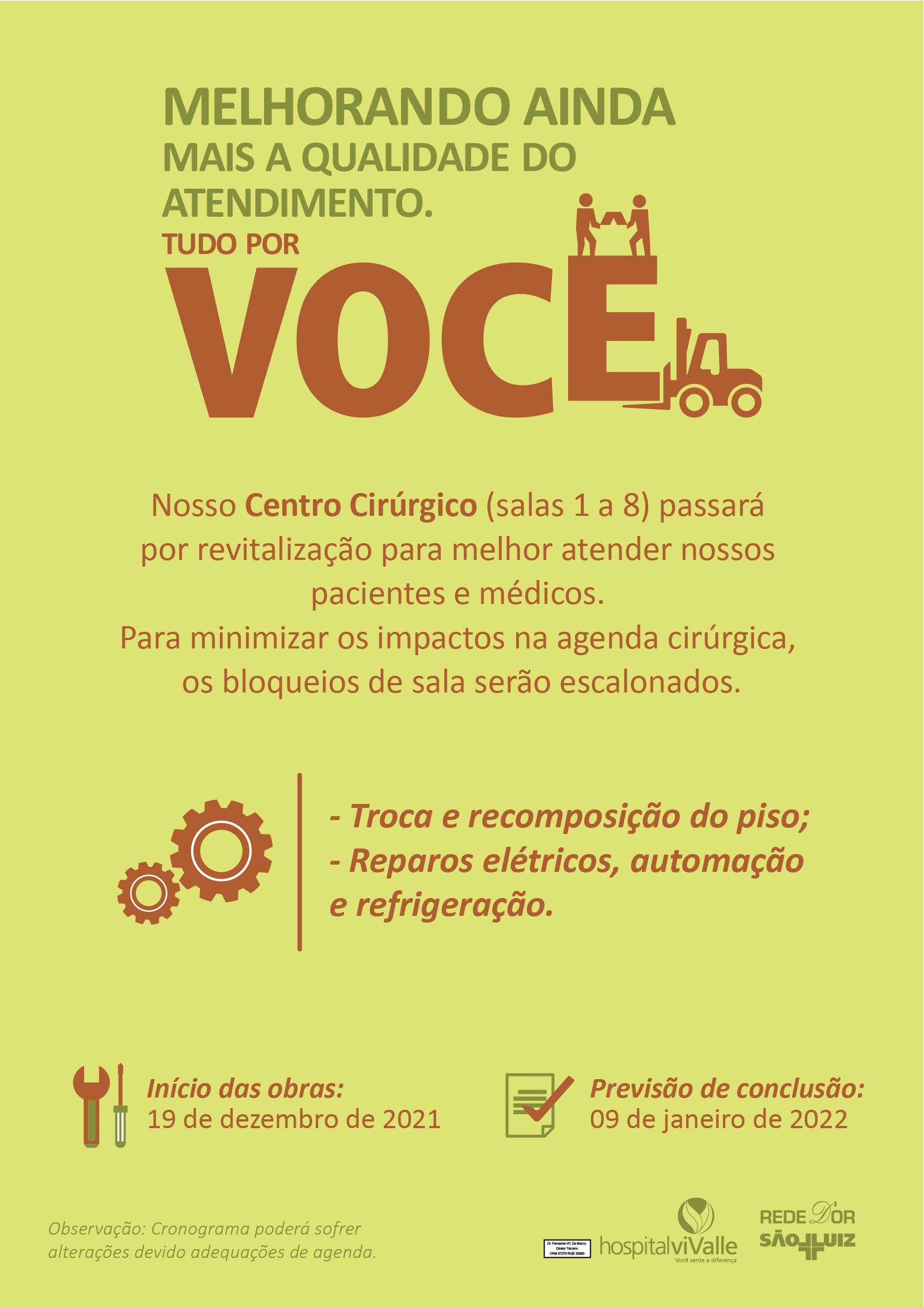 O Hospital viValle realizará melhorias no Centro Cirúrgico, mantendo a qualidade dos serviços e instalações. O processo de revitalização terá início no dia 19 de dezembro. A previsão de conclusão está para o dia 9 de janeiro de 2022 (o cronograma poderá sofrer alterações devido adequações de agenda).