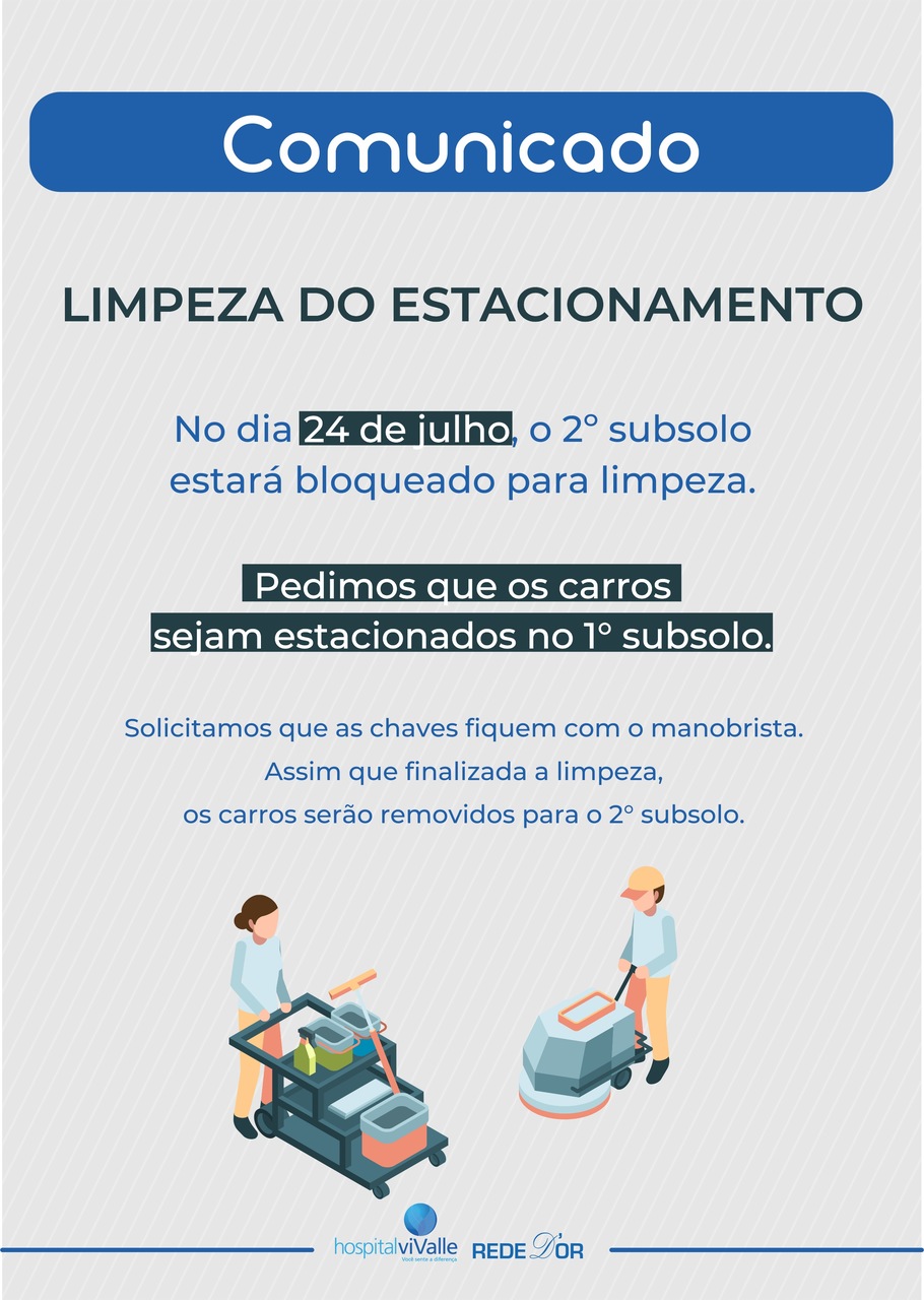 Comunicamos que no dia 24 de julho (domingo), o 2º subsolo estará bloqueado para limpeza.