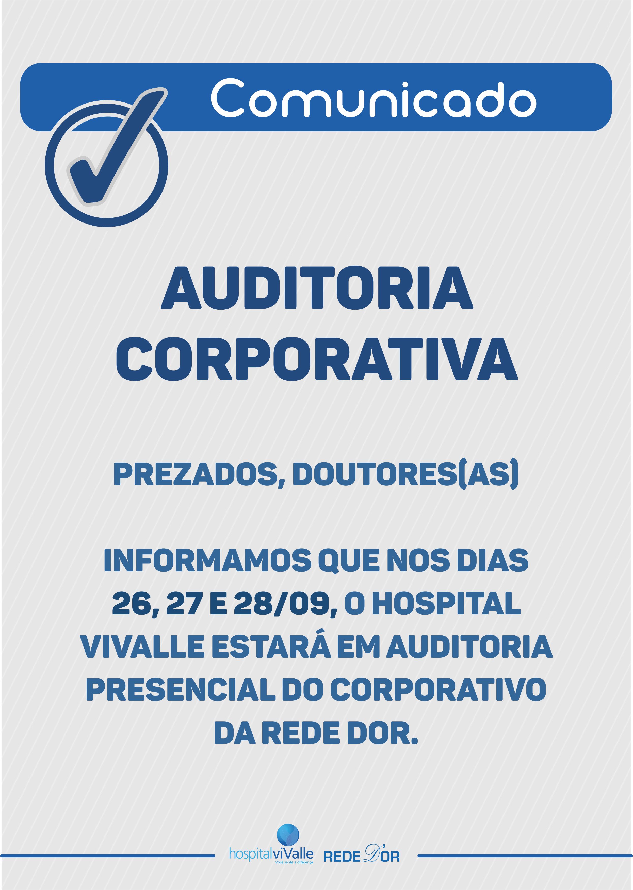 Informamos que nos dias 26, 27 e 28 de setembro, o Hospital viValle estará em auditoria presencial da equipe corporativa da Rede D'Or.