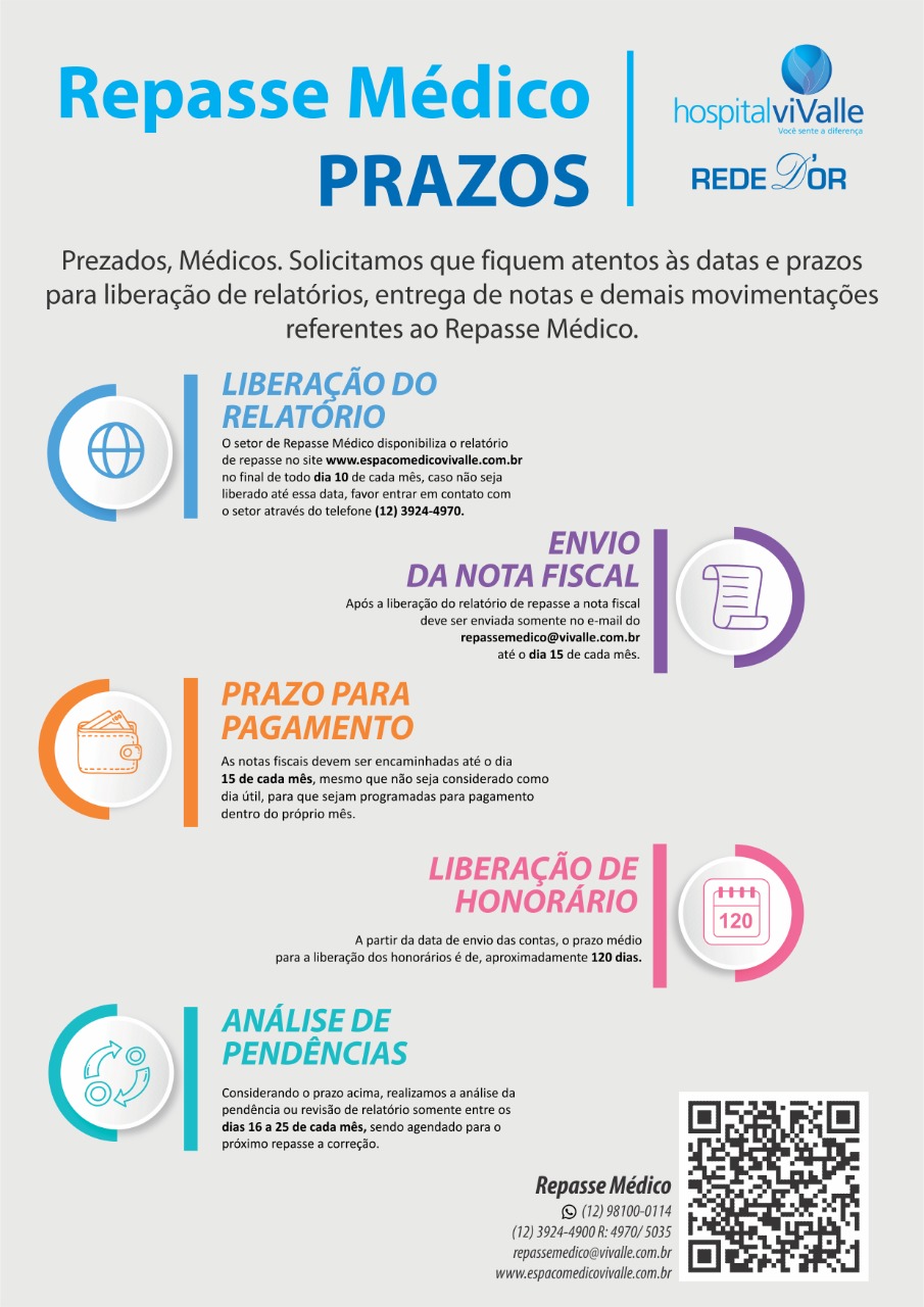 Após a liberação do relatório de repasse a nota fiscal deve ser enviada somente no e-mail do repassemedico@vivalle.com.br até o dia 15 de cada mês.