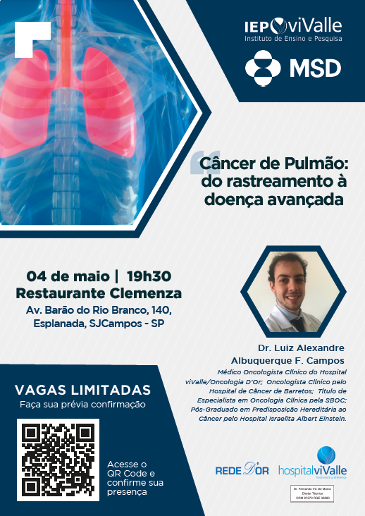 O IEP viValle e a MSD promovem no dia 4 de maio (5ª feira), no Restaurante Clemenza (Av. Barão do Rio Branco, 140, Esplanada, SJCampos - SP), às 19h30, uma aula com Dr. Luiz Alexandre Albuquerque F. Campos sobre Câncer de Pulmão.