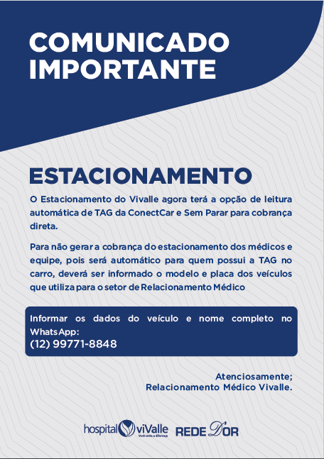 O Estacionamento do Vivalle agora terá a opção de leitura automática de TAG da ConectCar e Sem Parar para cobrança direta. Para não gerar a cobrança do estacionamento dos médicos e equipe, pois será automático para quem possui a TAG no carro, deverá ser informado o modelo e placa dos veículos que utiliza para o setor de Relacionamento Médico