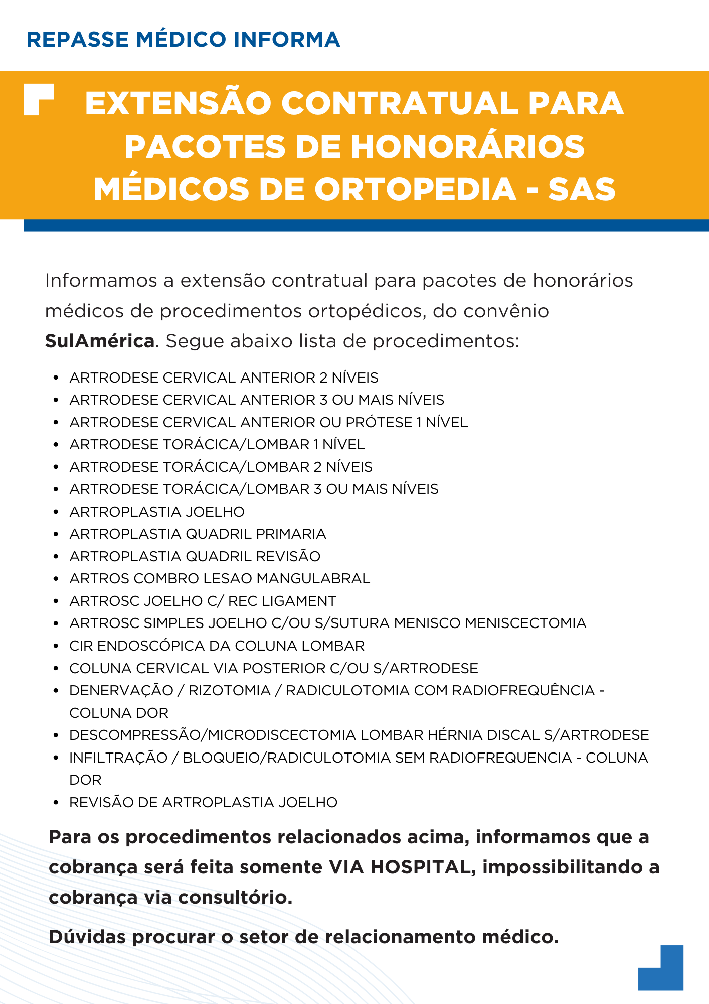 Informamos a extensão contratual para pacotes de honorários médicos de procedimentos ortopédicos, do convênio SulAmérica.
