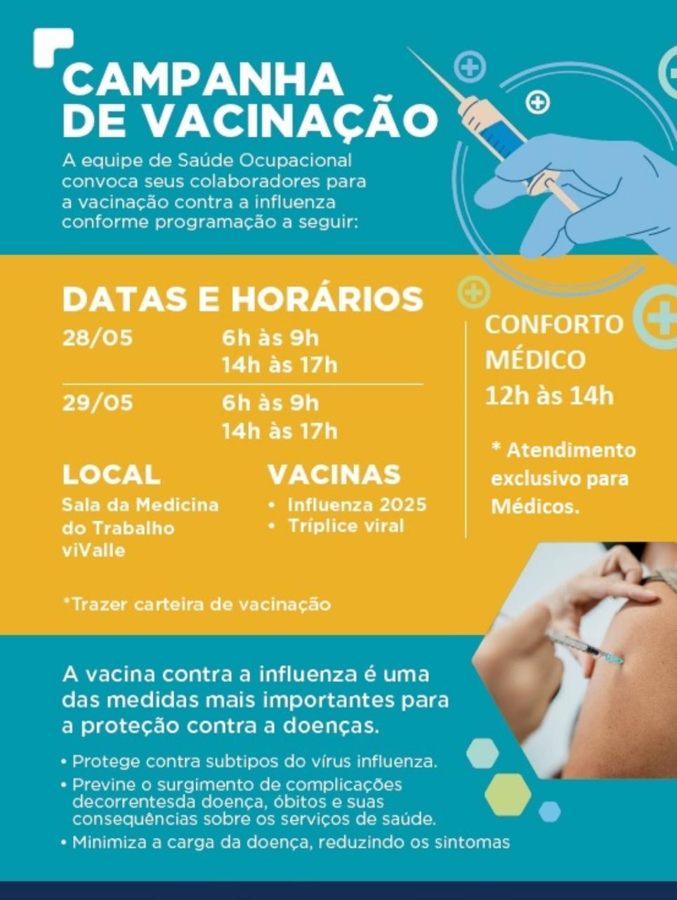A equipe de Saúde Ocupacional Convoca colaboradores e médicos para a vacinação contra a Influenza e Tríplice viral, conforme programação a seguir: