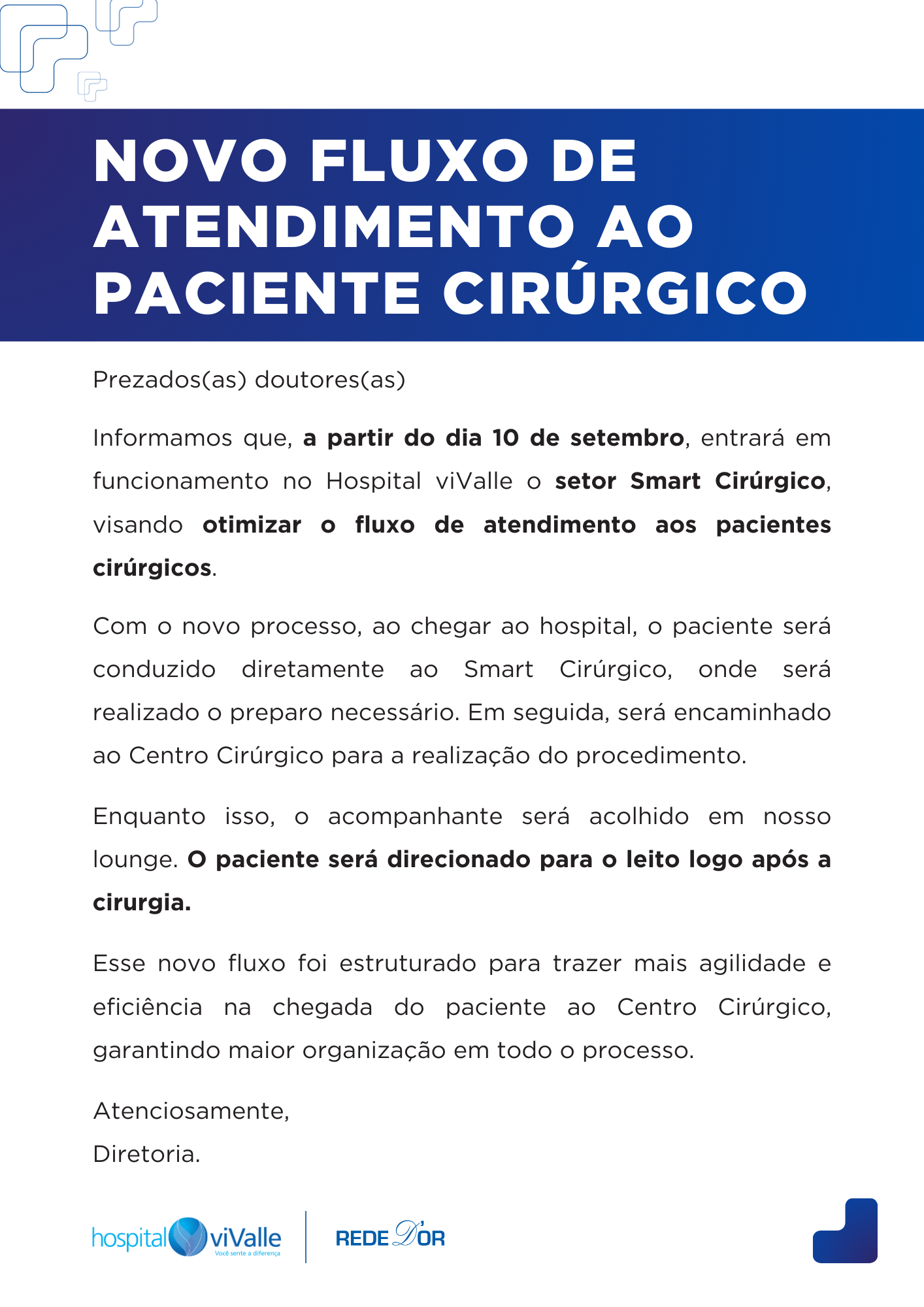 Esse novo fluxo foi estruturado para trazer mais agilidade e eficiência na chegada do paciente ao Centro Cirúrgico, garantindo maior organização em todo o processo.